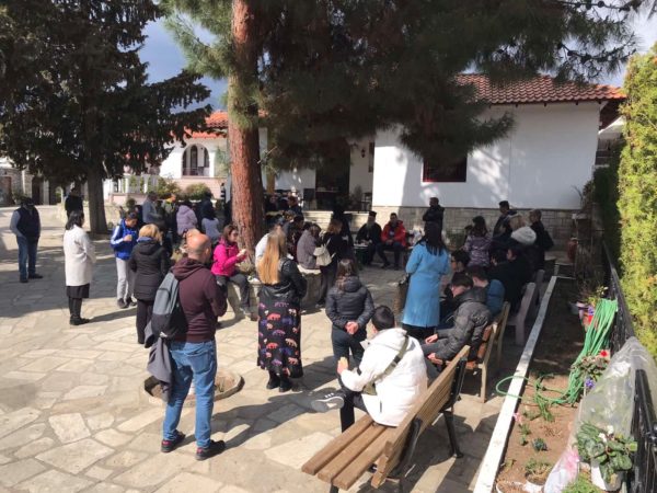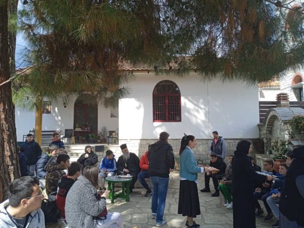 Στην πλακόστρωτη αυλή του μοναστηριού, κάτω από τα πεύκα, δίπλα στον τάφο του Οσίου ακολούθησε κέρασμα από τις φιλόξενες αδελφές της Μονής.