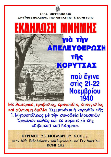 Εκδήλωση μνήμης για την απελευθέρωση της Κορυτσάς διοργανώνεται από την Ιερά Μητρόπολη Δρυϊνουπόλεως, Πωγωνίας και Κονίτσης με θεατρικό, προβολές, τραγούδια, απαγγελίες και σύντομη ομιλία, στις 25 Νοεμβρίου 2018 και ώρα 6.00 μ.μ. στην Αίθουσα Εκδηλώσεων του Γυμνασίου και Γενικού Λυκείου Κονίτσης.
