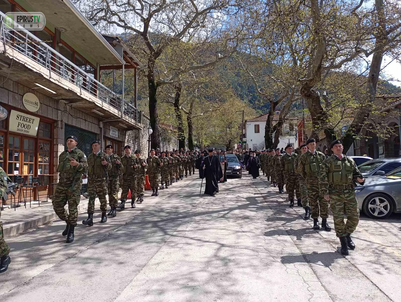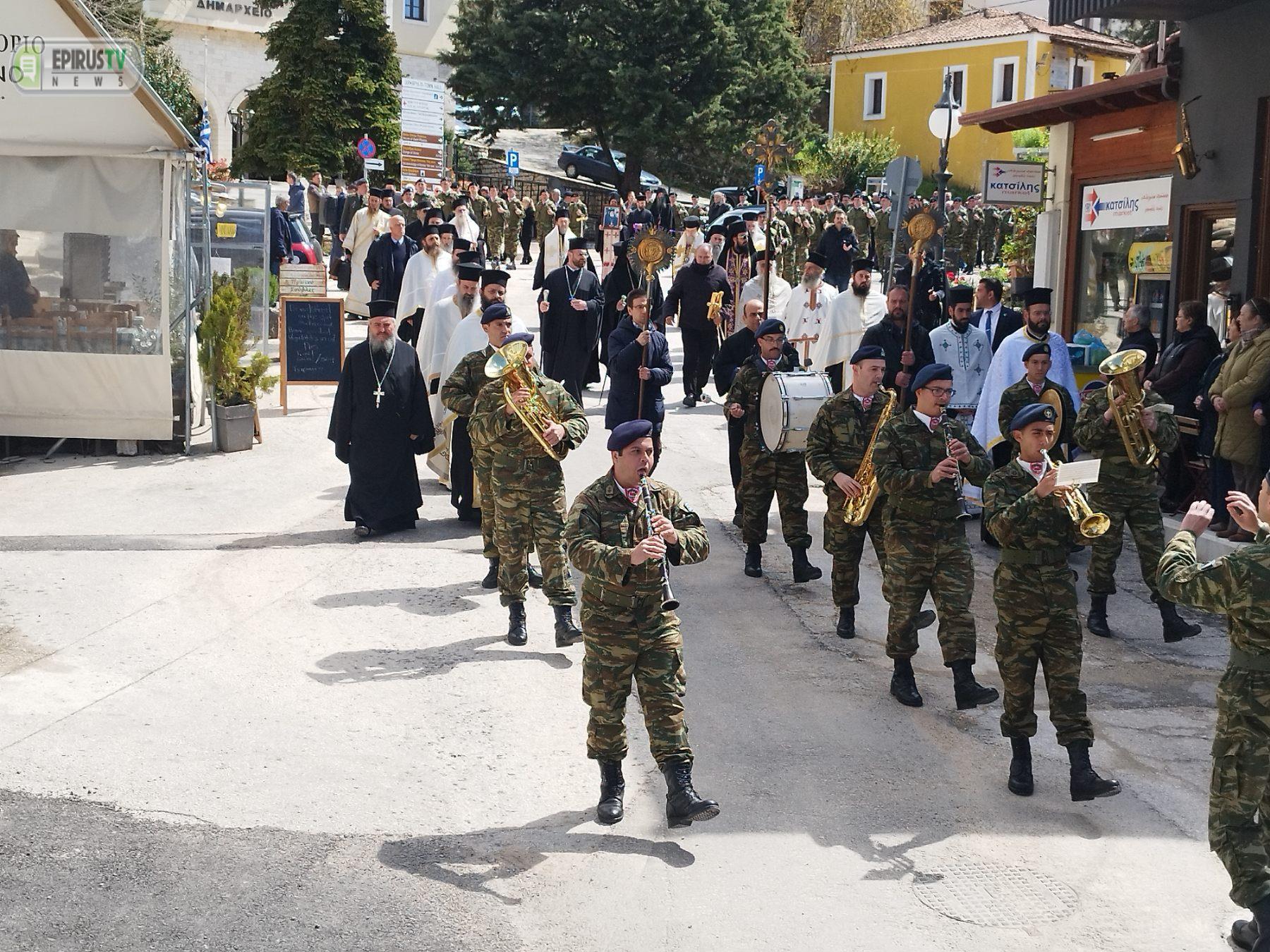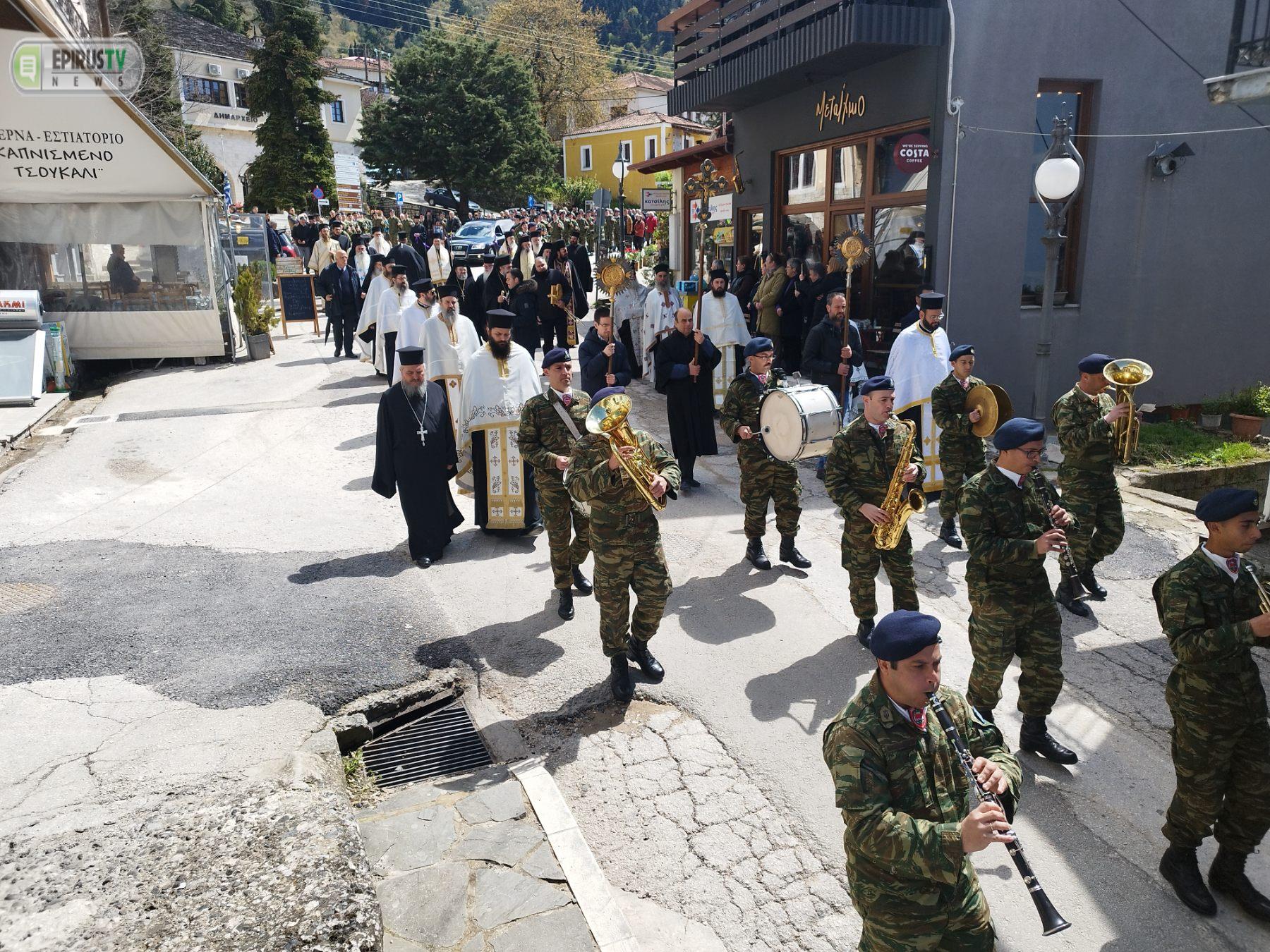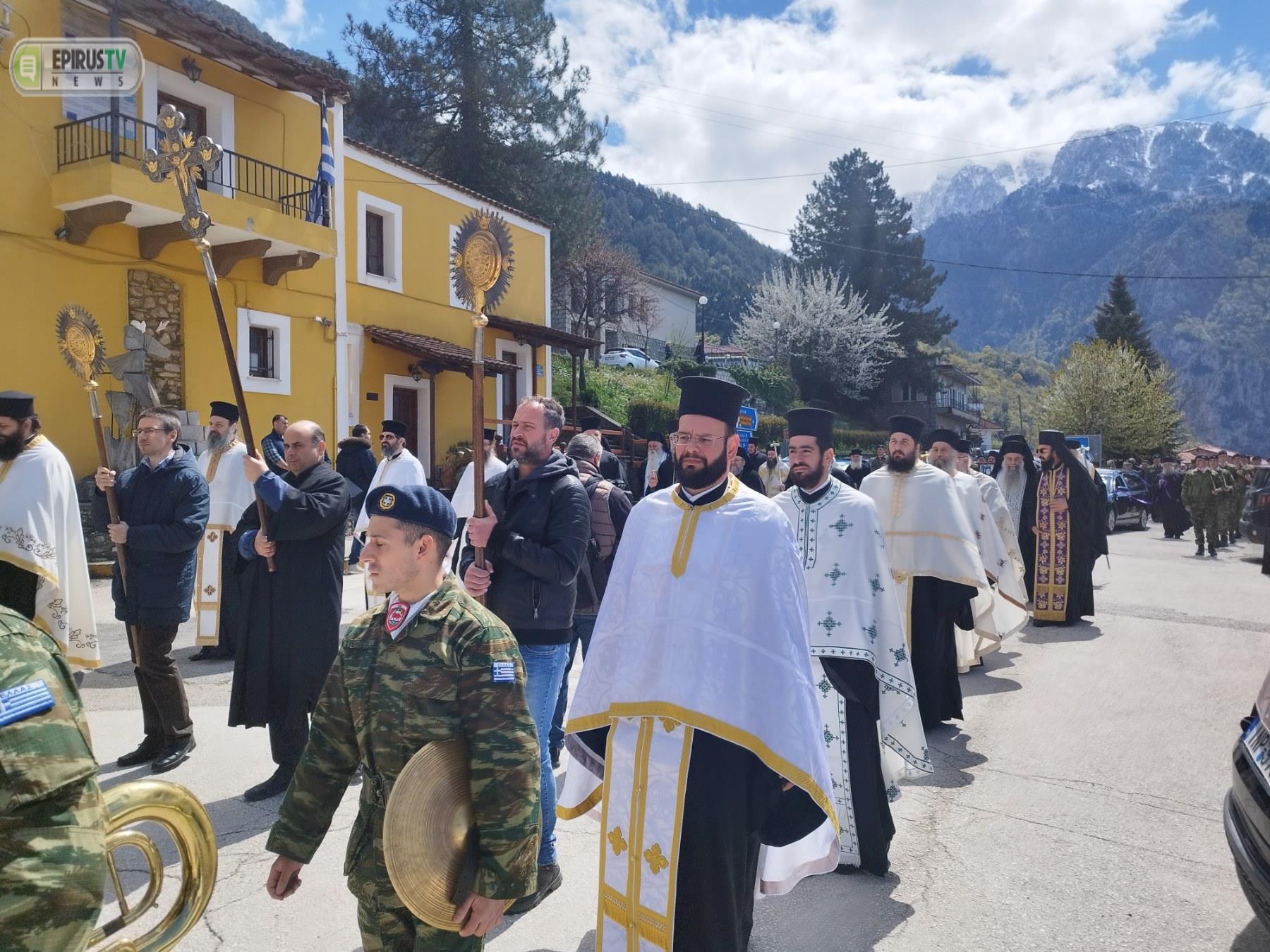Μετά την Εξόδιο Ακολουθία που τελέστηκε στον Προσκυνηματικό Ιερό Ναό Αγίου Κοσμά του Αιτωλού στην Κόνιτσα, ακολούθησε περιφορά του σκηνώματός του μακαριστού Ιεράρχη στους δρόμους της πόλης.
