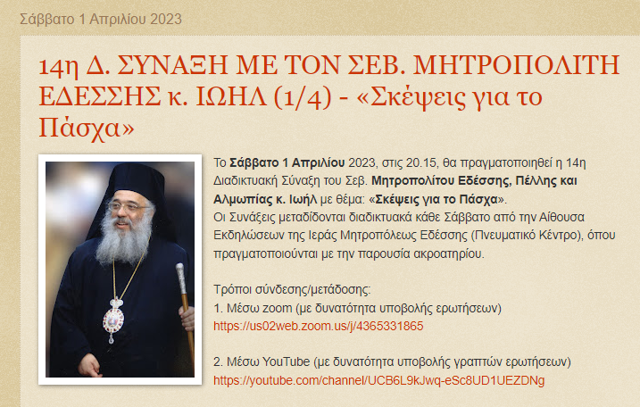 Η 14η Διαδικτυακή Σύναξη του Σεβασμιωτάτου Μητροπολίτη Εδέσσης, Πέλλης και Αλμωπίας κ. Ιωήλ θα πραγματοποιηθεί σήμερα στις 20:15 με θέμα: «Σκέψεις για το Πάσχα».