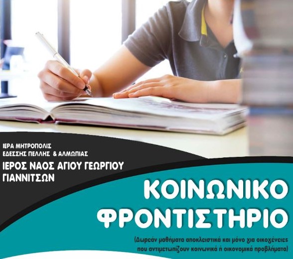 Για 15η συνεχόμενη χρονιά η ενορία Αγίου Γεωργίου Γιαννιτσών διοργανώνει δωρεάν φροντιστηριακά μαθήματα για το σχολικό έτος 2022-2023, τα οποία απευθύνονται σε παιδιά Δημοτικού, Γυμνασίου και Λυκείου και αφορούν αποκλειστικά οικογένειες που αντιμετωπίζουν κοινωνικά ή οικονομικά προβλήματα.