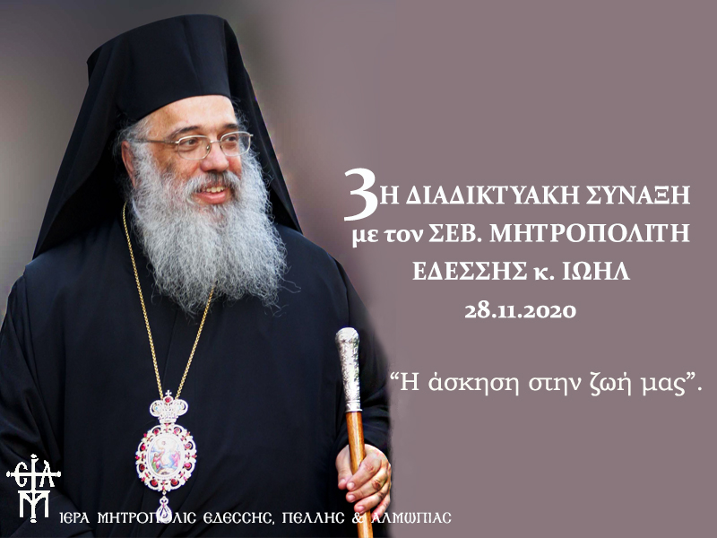 Το Σάββατο 28 Νοεμβρίου 2020, στις 20.15, θα πραγματοποιηθεί σε ζωντανή διαδικτυακή μετάδοση μέσω των εφαρμογών Zoom και YouTube η 3η Διαδικτυακή Σύναξη με τον Σεβασμιώτατο Μητροπολίτη Εδέσσης, Πέλλης και Αλμωπίας κ. Ιωήλ και θέμα: «Η άσκηση στην ζωή μας».