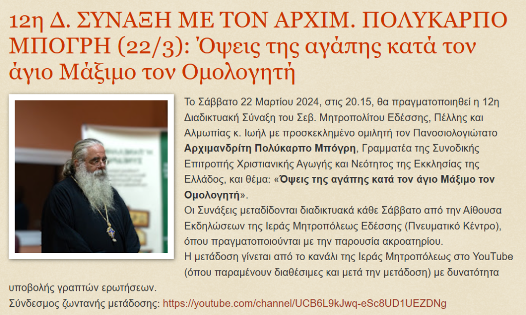 Σήμερα στις 20.15, θα πραγματοποιηθεί η 12η Διαδικτυακή Σύναξη του Σεβ. Μητροπολίτη Εδέσσης, Πέλλης και Αλμωπίας κ. Ιωήλ με προσκεκλημένο ομιλητή τον Πανοσιολογιώτατο Αρχιμανδρίτη Πολύκαρπο Μπόγρη, Γραμματέα της Συνοδικής Επιτροπής Χριστιανικής Αγωγής και Νεότητος της Εκκλησίας της Ελλάδος, και θέμα: «Όψεις της αγάπης κατά τον άγιο Μάξιμο τον Ομολογητή».