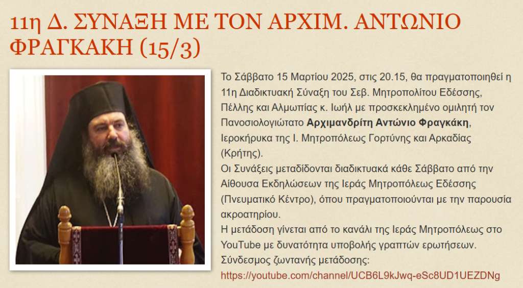 Το Σάββατο 15 Μαρτίου 2025, στις 20.15, θα πραγματοποιηθεί η 11η Διαδικτυακή Σύναξη του Σεβ. Μητροπολίτου Εδέσσης, Πέλλης και Αλμωπίας κ. Ιωήλ με προσκεκλημένο ομιλητή τον Πανοσιολογιώτατο Αρχιμανδρίτη Αντώνιο Φραγκάκη, Ιεροκήρυκα της Ι. Μητροπόλεως Γορτύνης και Αρκαδίας (Κρήτης).