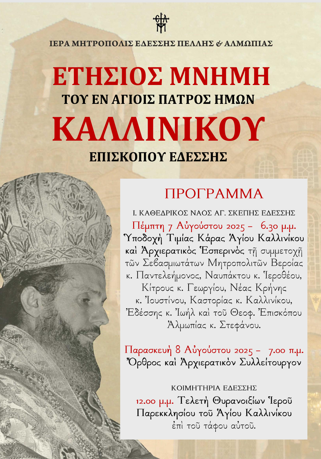 Την Παρασκευή 8 Αυγούστου, μνήμη του Αγίου Καλλινίκου Επισκόπου Εδέσσης, θα πραγματοποιηθεί πανηγυρικός εορτασμός στον Ι. Καθεδρικό Ναό Αγίας Σκέπης Εδέσσης. Επίσης, την ημέρα της εορτής, θα τελεσθούν και τα Θυρανοίξια του Ι. Παρεκκλησίου του Αγίου Καλλινίκου επί του τάφου του, στα Κοιμητήρια Εδέσσης.