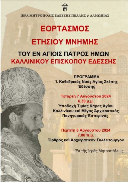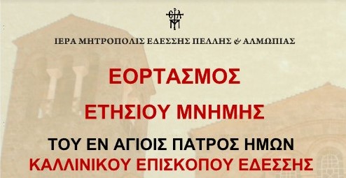 Την Πέμπτη 8 Αυγούστου, η Ιερά Μητρόπολη Εδέσσης, Πέλλης και Αλμωπίας θα εορτάσει επισήμως και με την δέουσα λαμπρότητα τη μνήμη του Αγίου Καλλινίκου Επισκόπου Εδέσσης στον Ιερό Καθεδρικό Ναό Αγίας Σκέπης Εδέσσης.