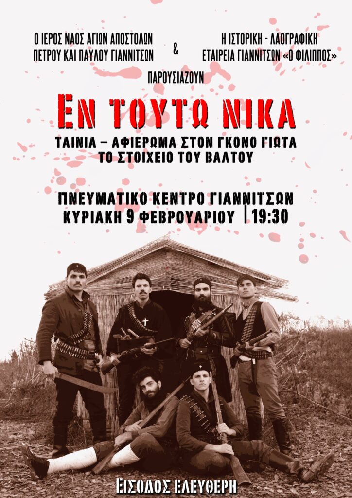 Οι Κατηχητικές Ενοριακές Συνάξεις του Ιερού Ναού Αγίων Αποστόλων Πέτρου και Παύλου Γιαννιτσών σε συνεργασία με την ΙΣΤΟΡΙΚΗ και ΛΑΟΓΡΑΦΙΚΗ ΕΤΑΙΡΕΙΑ ΓΙΑΝΝΙΤΣΩΝ «Ο ΦΙΛΙΠΠΟΣ» παρουσιάζουν την ταινία «ΕΝ ΤΟΥΤΩ ΝΙΚΑ». Αφιέρωμα στον ηρωικό Μακεδονομάχο Γκόνο Γιώτα, το «Στοιχειό του βάλτου».