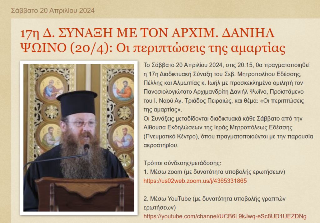 Η 17η Διαδικτυακή Σύναξη του Σεβασμιωτάτου Μητροπολίη Εδέσσης, Πέλλης και Αλμωπίας κ. Ιωήλ θα πραγματοποιηθεί σήμερα στις 20:15, με προσκεκλημένο ομιλητή τον Πανοσιολογιώτατο Αρχιμανδρίτη Δανιήλ Ψωΐνο, Προϊστάμενο του Ι. Ναού Αγ. Τριάδος Πειραιώς, και θέμα: «Οι περιπτώσεις της αμαρτίας».
