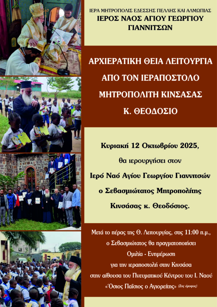 Την Κυριακή 12 Οκτωβρίου 2025 θα ιερουργήσει στον Ιερό Ναό Αγίου Γεωργίου Γιαννιτσών ο Σεβασμιώτατος Μητροπολίτης Κινσάσας κ. Θεοδόσιος.