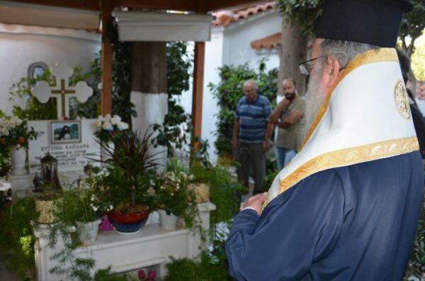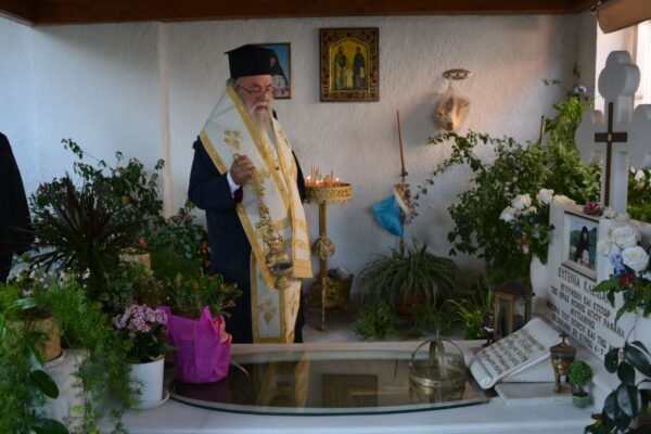 Μετά το τέλος της Θείας Λειτουργίας, ο Σεβασμιώτατος τέλεσε πρώτα κατά καθήκον τρισάγιο στον τάφο του Μακαριστού Μητροπολίτου Μυτιλήνης και κτήτορος της Μονής κυρού Ιακώβου Β΄ στο νάρθηκα του Ναού και εν συνεχεία στην μακαριστή Ηγουμένη της Ιεράς Μονής Ευγενείας Κλειδαρά παρουσία της Ηγουμένης της Μονής Ταβιθάς.