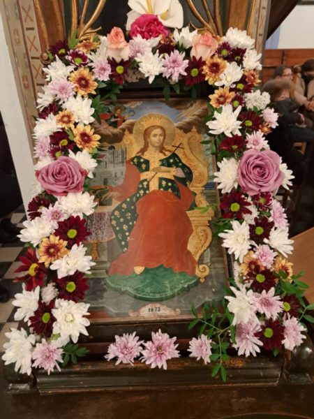 Προ του πέρατος της Θείας Λειτουργίας πραγματοποιήθηκε η λιτάνευση της Ιεράς Εικόνας της Αγίας Ειρήνης και ευλογήθηκε η παραδοσιακή πανήγυρις.