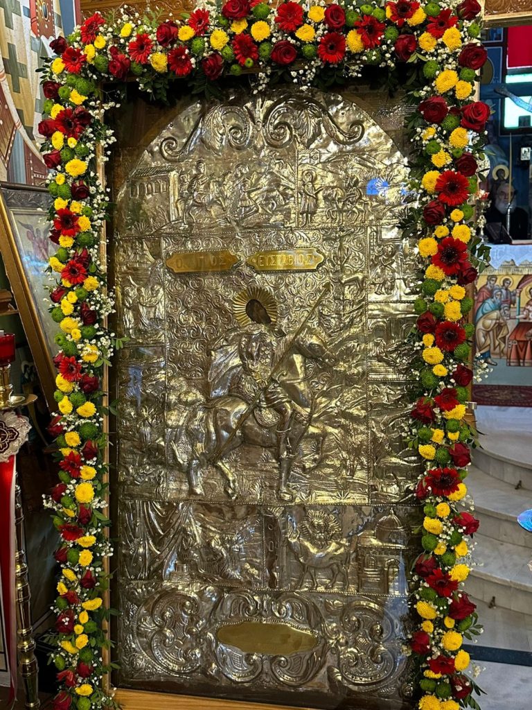 Προ του πέρατος της Θείας Λειτουργίας πραγματοποιήθηκε η λιτάνευση της Ιεράς Εικόνας του Αγίου Ευσταθίου και ευλογήθηκε η παραδοσιακή πανήγυρις.