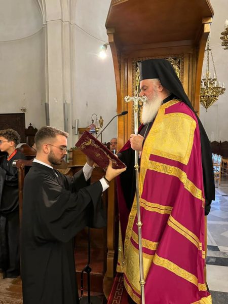 Την κυριώνυμο ημέρα, 14η Σεπτεμβρίου, στον κατάμεστο από πιστούς περικαλλή Ιερό Ναό του Τιμίου Σταυρού, στo τέλος του Όρθρου του οποίου χοροστάτησε ο οικείος Ποιμενάρχης, Σεβασμιώτατος κ. Αμφιλόχιος, πραγματοποιήθηκε η καθιερωμένη τελετή της Υψώσεως του Τιμίου Σταυρού και κατόπιν τελέστηκε Τρισαρχιερατική Θεία Λειτουργία, προεξάρχοντος του Σεβασμιωτάτου Μητροπολίτου Κηφισίας κ. Κυρίλλου, ο οποίος είχε και τη διακονία του Λόγου,και συνιερουργούντων των Σεβασμιωτάτων Μητροπολιτών Καλαβρύτων και Αιγιαλείας κ. Ιερωνύμου και Θήρας κ. Αμφιλοχίου.
