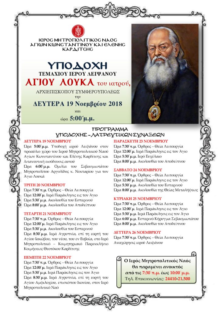 Τεμάχιο του Ιερού λειψάνου του αγίου Λουκά του Ιατρού (προερχόμενο εκ της ιεράς μητροπόλεως Αργολίδος) θα υποδεχθούν τη Δευτέρα οι πιστοί της Καρδίτσας. Συγκεκριμένα η υποδοχή θα πραγματοποιηθεί στον προαύλιο χώρο του ιερού ναού αγίων Κωνσταντίνου και Ελένης Καρδίτσης στις 17.00, ενώ στις 18.00 θα ακολουθήσει ομιλία από τον Μητροπολίτη Αργολίδος κ. Νεκτάριο. Καθημερινά θα τελούνται πρωί και απόγευμα ιερές ακολουθίες, ενώ η αναχώρηση του ιερού θησαυρίσματος θα γίνει τη Δευτέρα 26 Νοεμβρίου. Ο εν λόγω ιερός ναός θα παραμένει ανοικτός από τις 7.30 το πρωί έως τις 22.00 το βράδυ.