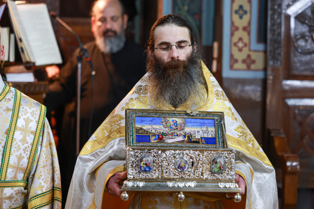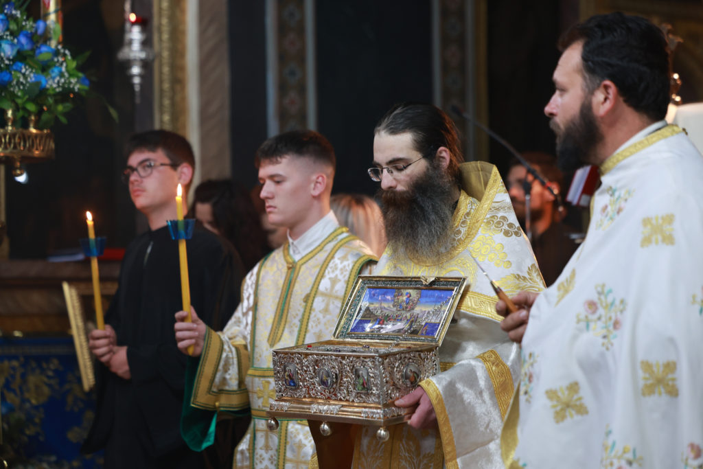 Είχε προηγηθεί σε κλίμα της αναστάσιμης χαράς το απόγευμα της Κυριακής του Παραλύτου, 11 Μαϊου 2025, η υποδοχή της Τιμίας Ζώνης της Υπεραγίας Θεοτόκου εκ της Ιεράς Μεγίστης Μονής Βατοπαιδίου. Το μοναδικό Θεομητορικό κειμήλιο από την επίγεια ζωή της Παναγίας μας κόμισε ο Καθηγούμενος της Μονής, Γέροντας Εφραίμ, με τη συνοδεία Βατοπαιδινής αδελφότητας και την υποδέχθηκε ο Μητροπολίτης Θεσσαλιώτιδος και Φαναριοφερσάλων κ. Τιμόθεος, ο ιερός κλήρος, οι άρχοντες και ο πιστός λαός ο οποίος από τις πρώτες ώρες της άφιξης της Αγίας Ζώνης συρρέει για να την προσκυνήσει.