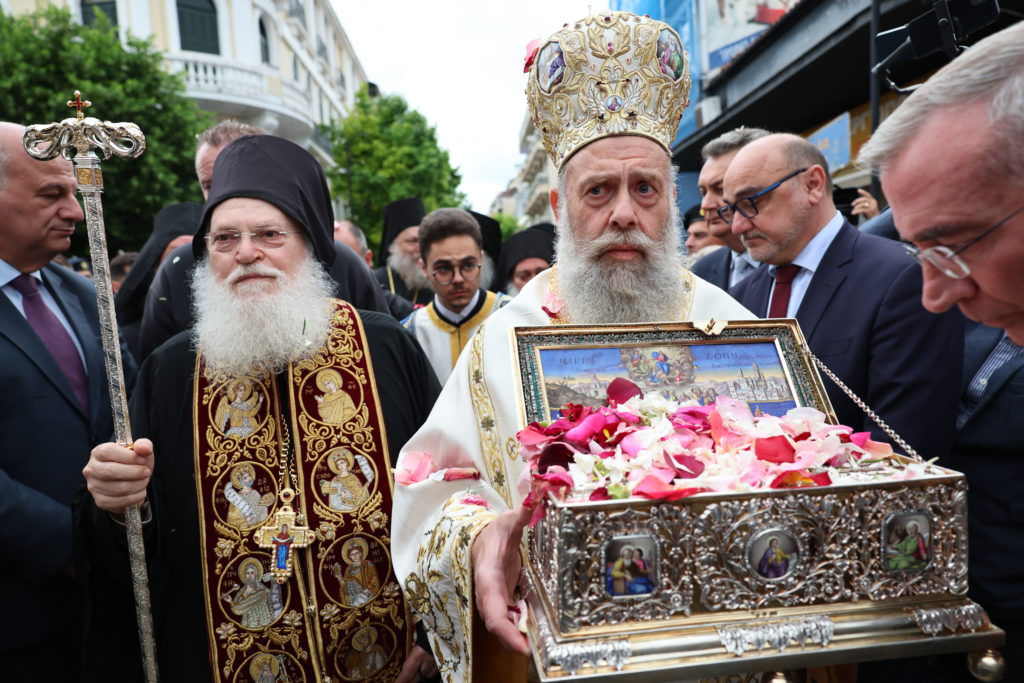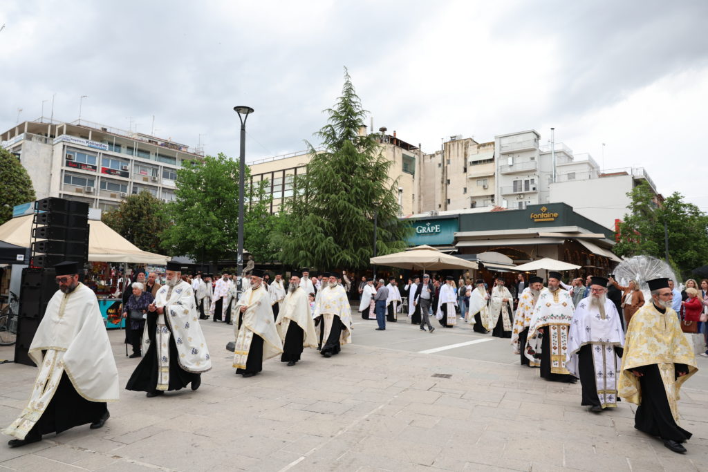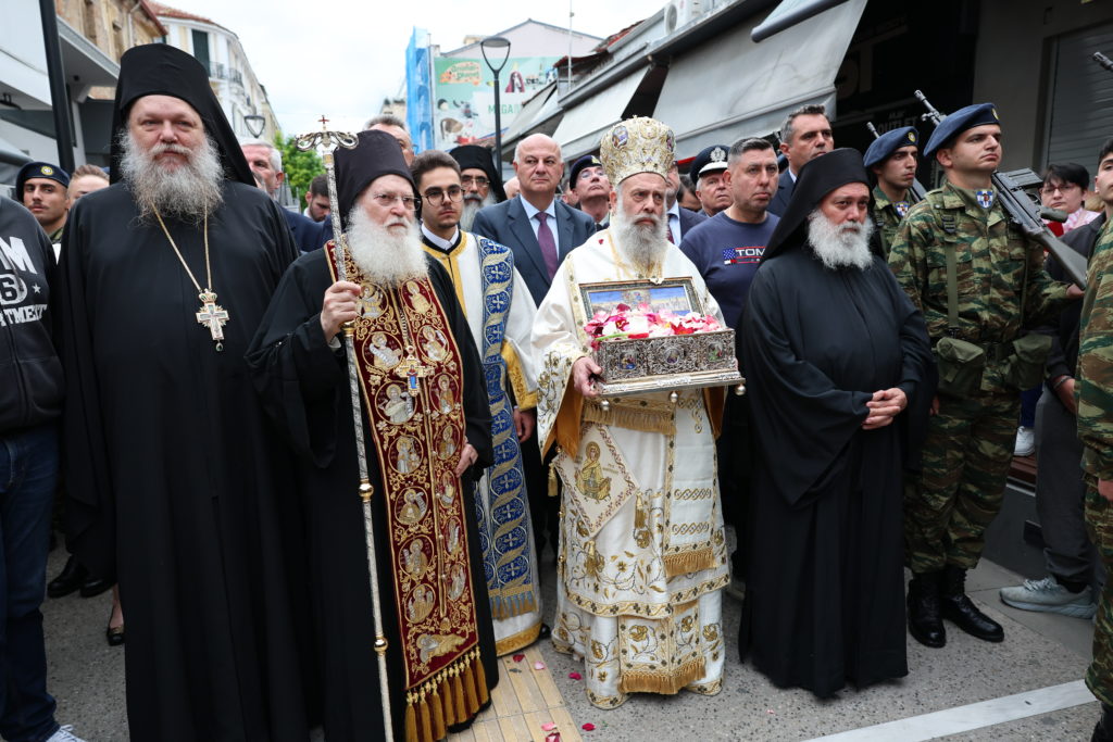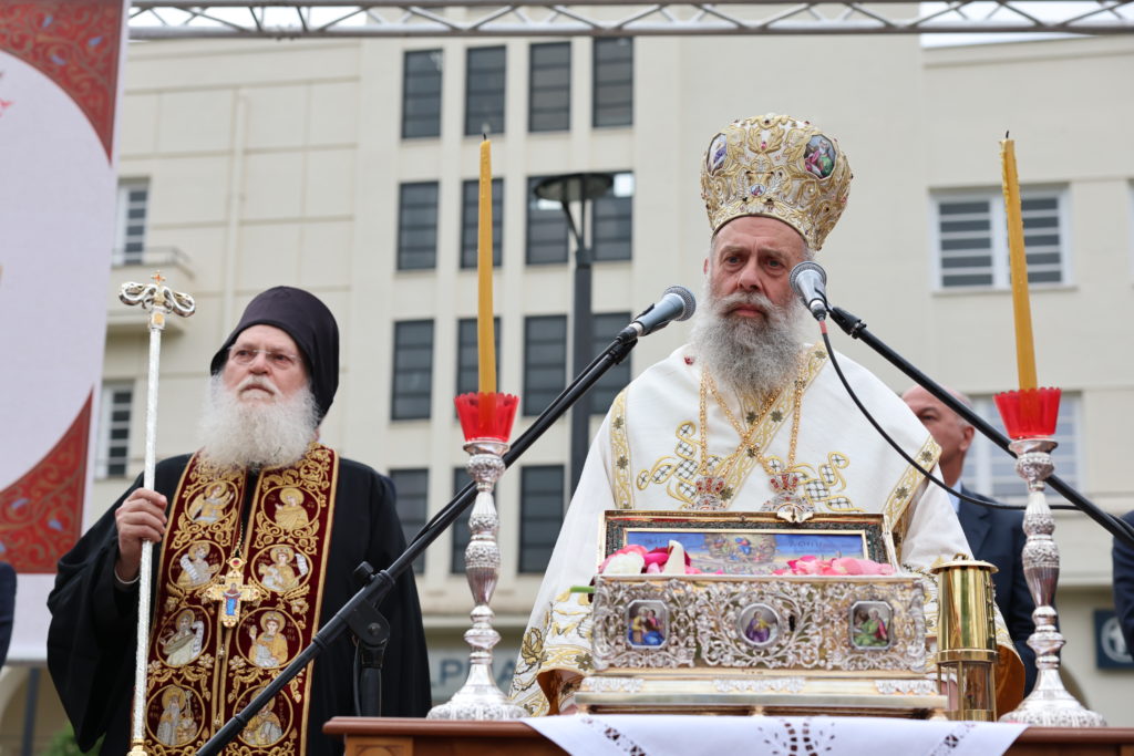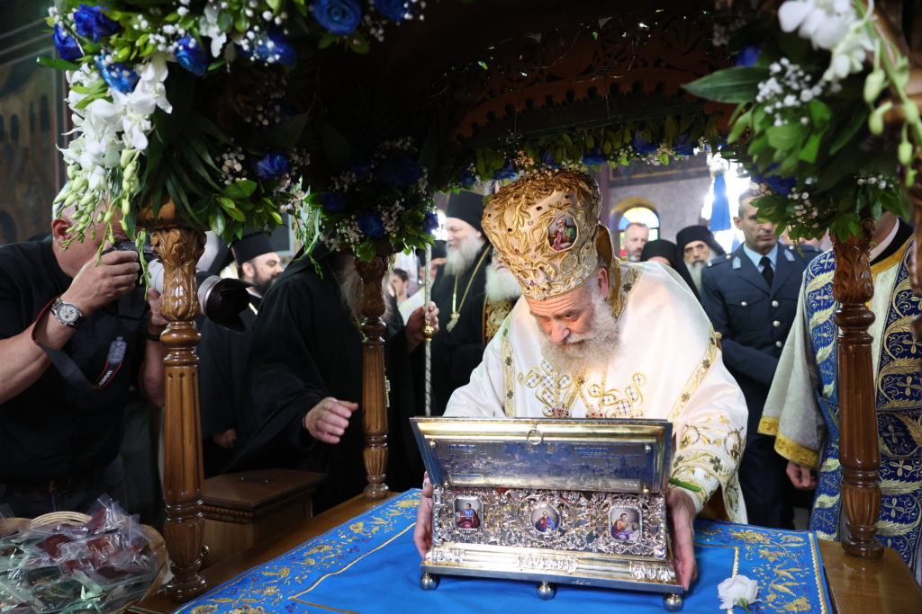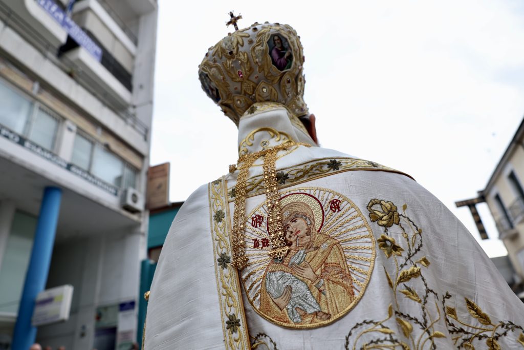 Ακολούθως, υπό τον ήχο των χαρμόσυνών κωδωνοκρουσιών του Μητροπολιτικού Ναού, θεομητορικούς ύμνους τους οποίους απέδωσαν οι χοροί, καθώς και τη συνοδεία του τιμητικού αγήματος, η λιτανευτική πομπή κατευθύνθηκε προς τον Ιερό Ναό όπου τελέστηκε Δοξολογία.