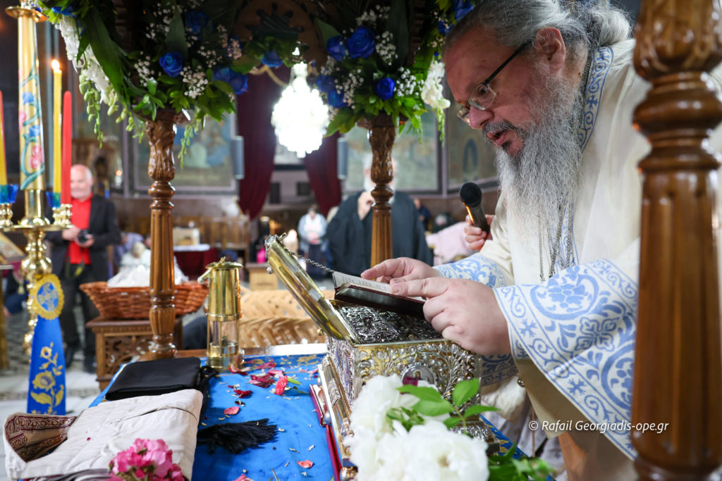 Καθώς επίσης και όλους εσάς, που δεν φοβηθήκατε τη βροχή, δεν φοβηθήκατε το τί συμβαίνει έξω από τον Ναό και ήρθατε εδώ και παραμείνατε στη θαλπωρή του Ναού, στη ζέστη της Αγκαλιάς της Παναγίας μας.