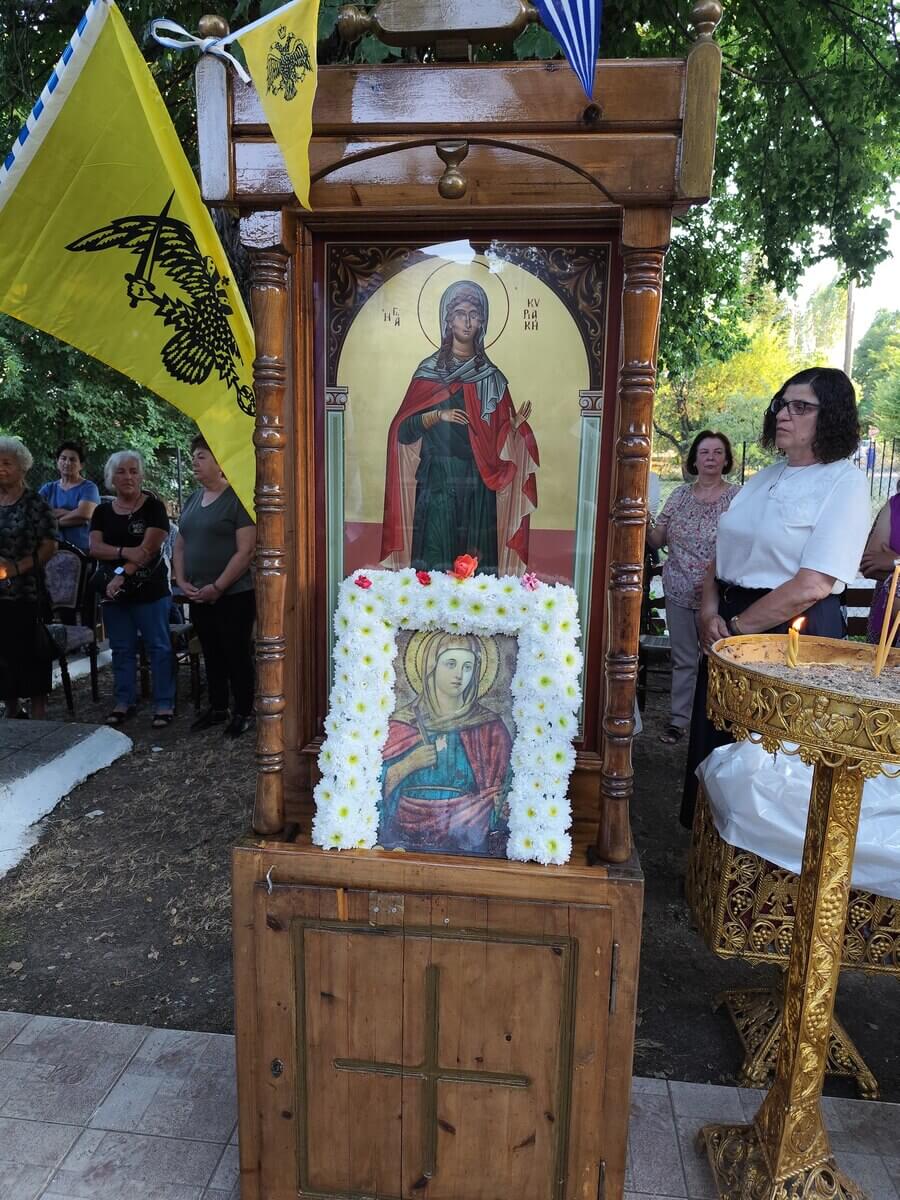 Εμείς όμως εδώ ήρθαμε απόψε να ψάλλουμε την Αγία Κυριακή. Ήρθαμε να προσκυνήσουμε το ιερό της εικόνισμα και αν είχαμε και τα ιερά της λείψανα – δείτε, το 289 μ.Χ., τον 3ο αιώνα – μαρτύρησε η Αγία, και από τότε μέχρι σήμερα την επικαλούμαστε, την τιμούμε. Γιατί παραμένει μια αδιάλειπτη αλυσίδα, ένας κρίκος μέσα στη ζωή της Εκκλησίας και στην παρουσία του Ιησού Χριστού στη ζωή των ανθρώπων. Αυτό είναι η Αγία Κυριακή!