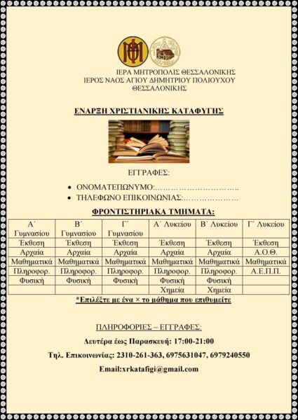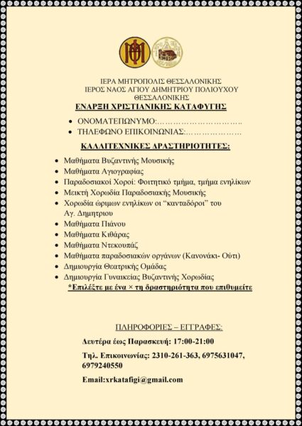 Με τη βοήθεια του Θεού και τις ευλογίες του Παναγιωτάτου Μητροπολίτου Θεσσαλονίκης κ. Ανθίμου και την επίβλεψη του π. Δαμασκηνού, Προϊσταμένου του Ιερού Προσκυνηματικού Ναού Αγίου Δημητρίου Πολιούχου Θεσσαλονίκης, από 1η Σεπτεμβρίου αρχίζουν οι εγγραφές των φροντιστηριακών μαθημάτων καθώς και όλων των δραστηριοτήτων της Χριστιανικής Καταφυγής. Οι δραστηριότητες πλούσιες, καθώς πέραν του κοινωνικού φροντιστηρίου, υπάρχουν μαθήματα βυζαντινής μουσικής, αγιογραφίας, μουσικών οργάνων, χορωδία, θεατρική ομάδα και άλλα.