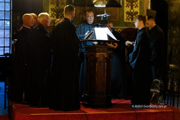 Τους ύμνους της μεγάλης εορτής απέδωσαν ιεροπρεπώς οι χοροί των ιεροψαλτών μαζί με τις χορωδίες τους, με προεξάρχοντα στον δεξιό χορό τον κ. Στυλιανό Ζαχαρίου και στον αριστερό τον κ. Αθανάσιο Πολίτη.