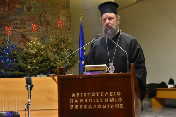 Ο Παναγιώτατος Μητροπολίτης Θεσσαλονίκης κ. Φιλόθεος στο μέσον της Εκδήλωσης ομίλησε επίκαιρα και με αφορμή ένα «Χριστουγεννιάτικο αντι-παραμύθι» του μακαριστού Καθηγητού της Θεολογικής Σχολής Αθηνών Ηλία Βουλγαράκη, αναφέρθηκε στο Μυστήριο της Σαρκώσεως του Θεού Λόγου τονίζοντας ιδιαιτέρως ότι «ο Θεός αγαπάει τον άνθρωπο και γι’ αυτό γεννιέται σαν άνθρωπος και ότι εμείς όλοι κάθε φορά πού γιορτάζουμε Χριστούγεννα καλούμαστε να βρούμε τον εαυτό μας, εφ’ όσον μάλιστα ο Χριστός, αν και «ο Παλαιός την ημερών», «νηπιάζει δι’ ημάς» και έτσι προσεγγίζει την ανθρώπινη μικρότητα, αυξάνει και κραταιούται «σοφία και ηλικία και χάριτι» και μας κάνει να μεγαλώνουμε εν Αυτώ. Και παράλληλα, και Εκείνος γεννιέται και μεγαλώνει μέσα μας, κάνει την καρδιά μας την δική Του φάτνη, όπως λέει ο Άγιος Μάξιμος ο Ομολογητής».