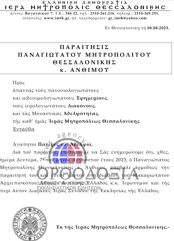 “Ἐκ τῆς Ἱερᾶς Μητροπόλεως Θεσσαλονίκης, ἀνακοινοῦται ὅτι, χθές, ἡμέρα Δευτέρα, 7η τοῦ μηνὸς Αὐγούστου ἔτους 2023, ὁ Παναγιώτατος Μητροπολίτης Θεσσαλονίκης κ. Ἄνθιμος, ὑπέβαλε ἁρμοδίως τὴν παραίτησή του καὶ ἔθεσε ἐαυτὸν στὴ διάθεση τοῦ Μακαριωτάτου Ἀρχιεπισκόπου Ἀθηνῶν & πάσης Ἑλλάδος κ.κ. Ἱερωνύμου καὶ τῆς περὶ Αὐτὸν Διαρκοῦς Ἱερᾶς Συνόδου τῆς Ἐκκλησίας τῆς Ἑλλάδος”.