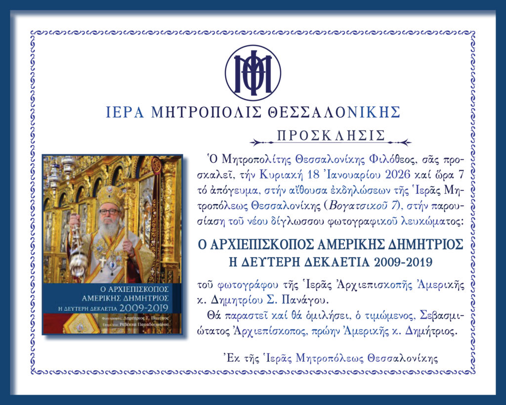 Η Ιερά Μητρόπολη Θεσσαλονίκης διοργανώνει την Κυριακή 18 Ιανουαρίου 2026, στις 7:00 το απόγευμα, στην αίθουσα εκδηλώσεών της (Βογατσικού 7), την παρουσίαση του νέου δίγλωσσου φωτογραφικού λευκώματος με τίτλο «Ο Αρχιεπίσκοπος Αμερικής Δημήτριος – Η δεύτερη δεκαετία 2009–2019», έργο του φωτογράφου της Ιεράς Αρχιεπισκοπής Αμερικής, κ. Δημητρίου Σ. Πανάγου.