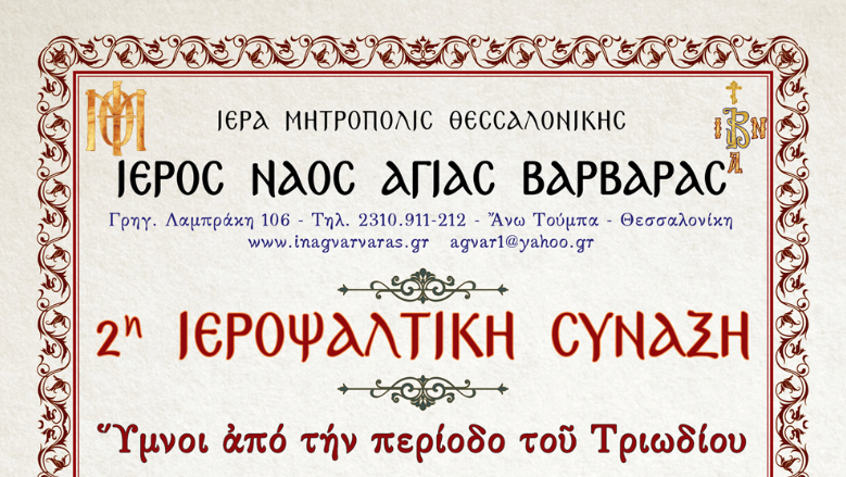 Εις τον Ιερόν Ναόν Αγίας Βαρβάρας Θεσσαλονίκης της Ιεράς Μητροπόλεως Θεσσαλονίκης, πραγματοποιείται η 2η Ιεροψαλτική Σύναξη με Ύμνους από την περίοδο του Τριωδίου, κατά την Κυριακή 17 Φεβρουαρίου 2019 και ώρα 7.30 της εσπέρας, εντός του Ιερού Ναού.