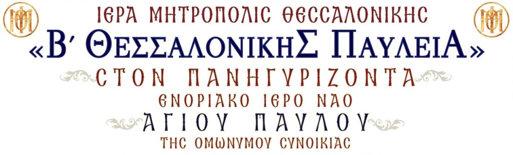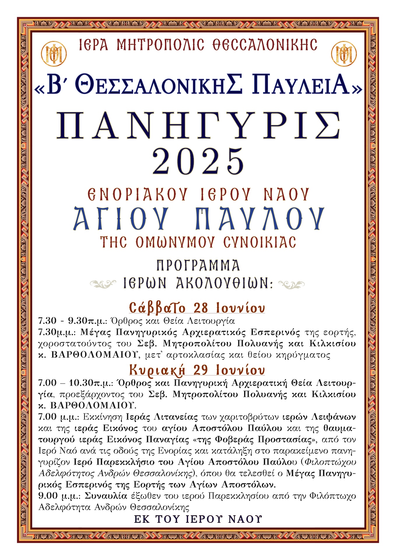 Από την Ιερά Μητρόπολη Θεσσαλονίκης -με την ευκαιρία της αναμενομένης εορτής στην ιερά μνήμη των αγίων ενδόξων πρωτοκορυφαίων Αποστόλων Πέτρου και Παύλου, την 29η Ιουνίου 2025- ανακοινώνεται η διοργάνωση πολύμορφων, λατρευτικών, επιστημονικών και πολιτιστικών Εκδηλώσεων προς τιμήν του Μεγάλου Αποστόλου των Εθνών, του Διδασκάλου των Θεσσαλονικέων και Φωτιστού των Ελλήνων Αγίου Αποστόλου Παύλου, υπό την ονομασία «B΄ ΘΕΣΣΑΛΟΝΙΚΗΣ ΠΑΥΛΕΙΑ».