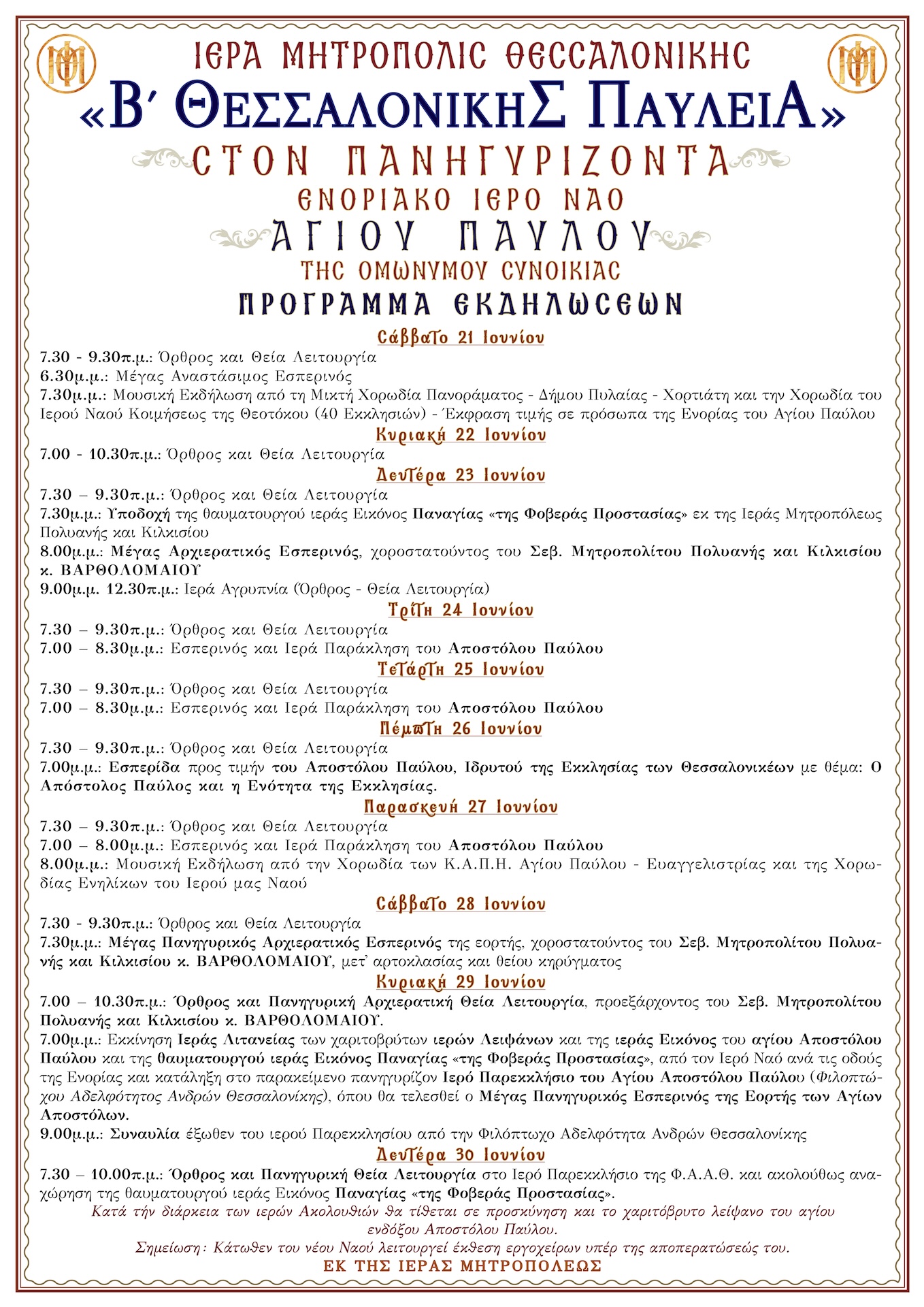 Το παραπάνω Πρόγραμμα, καθώς και αναλυτικά το Πρόγραμμα όλων των υπολοίπων εκδηλώσεων, που θα πραγματοποιηθούν στο πλαίσιο των Εκδηλώσεων «Β΄ ΘΕΣΣΑΛΟΝΙΚΗΣ ΠΑΥΛΕΙΑ», θα μπορούν οι ενδιαφερόμενοι να το παραλαμβάνουν από τους Ιερούς Ναούς της Μητροπόλεως. Προσκαλούνται όλοι οι Θεσσαλονικείς χριστιανοί μας να συμμετάσχουν στις εορταστικές εκδηλώσεις για τις Εορτές του ενοριακού Ναού του αγίου Αποστόλου Παύλου και στις Εκδηλώσεις «Β΄ ΘΕΣΣΑΛΟΝΙΚΗΣ ΠΑΥΛΕΙΑ», ώστε να τιμηθεί κατά τον πρέποντα τρόπο ο Απόστολος των Εθνών, αλλά και όλης της Ευρώπης και να δοθεί λαμπρότητα και εμφατικό περιεχόμενο και εφέτος στη μνήμη του ιδρυτού και φωτιστού της Τοπικής Εκκλησίας.