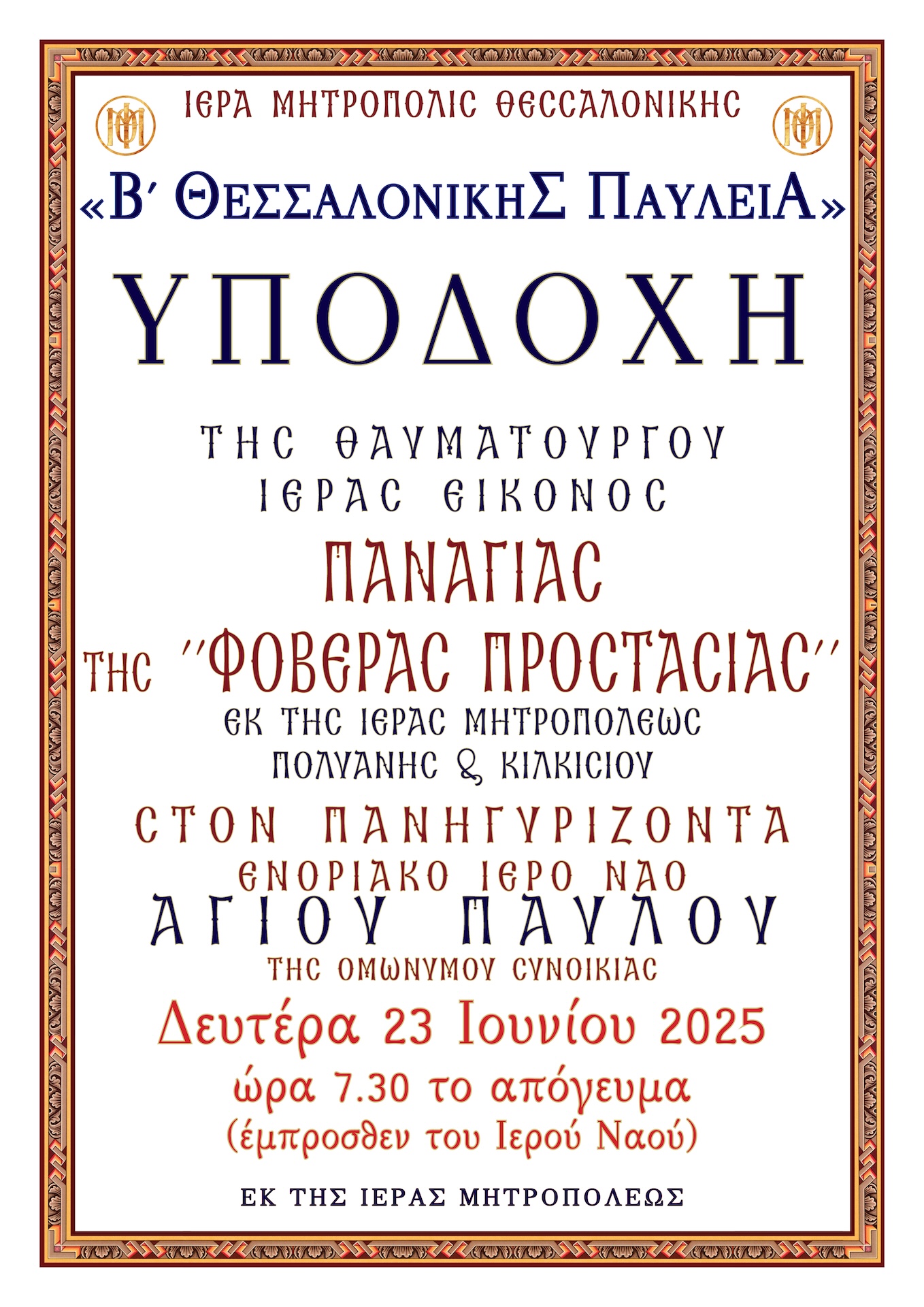 Την Δευτέρα, 23 Ιουνίου, στις 7:30 μ.μ., θα πραγματοποιηθεί έμπροσθεν του ενοριακού Ιερού Ναού του αγίου Παύλου, Υποδοχή της θαυματουργού ιεράς Εικόνος της Παναγίας «Φοβεράς Προστασίας» εκ της Ιεράς Μητροπόλεως Πολυανής και Κιλκισίου, την οποία θα προσκομίσει προσωπικώς, ο Σεβασμιώτατος Μητροπολίτης Πολυανής και Κιλκισίου κ. Βαρθολομαίος, ο οποίος και εν συνεχεία θα χοροστατήσει στον τελεσθησόμενο Μέγα Αρχιερατικό Εσπερινό, για την εορτή του Γενεθλίου του Τιμίου Προδρόμου.