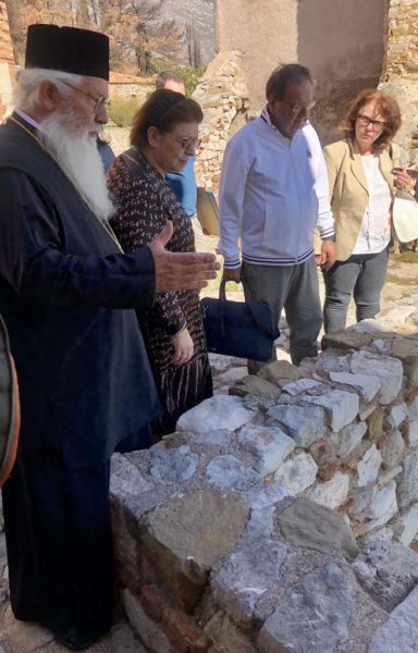 Η Λίνα Μενδώνη με τον Μητροπολίτη Θηβών και Λεβαδείας κατά τη διάρκεια αυτοψίας στην Ιερά Μονή Οσίου Λουκά