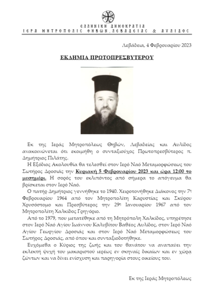 Η Ιερά Μητρόπολη Θηβών και Λεβαδείας και Αυλίδος ανακοινώνει ότι εκοιμήθη ο συνταξιούχος πρωτοπρεσβύτερος π. Δημήτριος Πιλάτης.