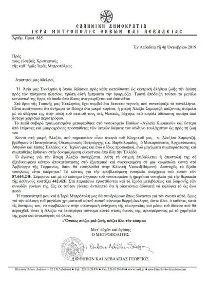 Η Εκκλησία μας διδάσκει το του αποστόλου Παύλου «εἴτε πάσχει ἓν μέλος, συμπάσχει πάντα τὰ μέλη, εἴτε δοξάζεται ἓν μέλος, συγχαίρει πάντα τὰ μέλη» (Α΄ Κορ. 12, 26). Η αλήθεια αυτή βρίσκει και πρέπει να βρίσκει εφαρμογή σε κάθε άνθρωπο που έχει ανάγκη, πόσο μάλλον όταν αυτός ο άνθρωπος είναι ένα μικρό παιδί, όπως η μικρή Αλεξία Σαμαρτζή από τις Θεσπιές, που χτυπήθηκε από σφαίρα την ημέρα του Πάσχα.