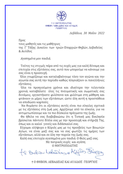 Τις ευχές του για καλή επιτυχία στις εξετάσεις τους έστειλε στους μαθητές της Γ’ Λυκείου της μητροπολιτικής του περιφέρειας ο Σεβασμιώτατος Μητροπολίτης Θηβών, Λεβαδείας και Αυλίδος κ. Γεώργιος μέσω της παρακάτω επιστολής: