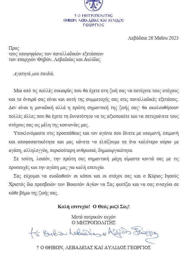 Υποκλινόμαστε στις προσπάθειες και τον αγώνα που δίνετε με υπομονή, επιμονή και αποφασιστικότητα και μας κάνετε να ελπίζουμε σε ένα καλύτερο αύριο με αγάπη, αλληλεγγύη, περισσότερη ανθρωπιά δημιουργικότητα. Σε τούτη, λοιπόν, την πρώτη σας σημαντική μάχη είμαστε κοντά σας με τις προσευχές και την αγάπη μας για καλή επιτυχία Σας εύχομαι να ευοδωθούν οι κόποι και οι στόχοι σας και ο Κύριος Ιησούς Χριστός δια πρεσβειών των Βοιωτών Αγίων να Σας φωτίζει και να σας ενισχύει σε κάθε βήμα της ζωής σας Καλή επιτυχία! Ο Θεός μαζί Σας!