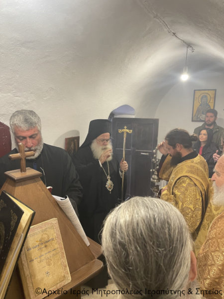 Στην ακολουθία του Μεγάλου πανηγυρικού Εσπερινού χοροστάτησε ο Μητροπολίτης Ιεραπύτνης και Σητείας κ. Κύριλλος, ο οποίος πριν την απόλυση ευλόγησε στον αύλειο χώρο τους προσφερόμενους άρτους και τέλεσε Τρισάγιο για την ανάπαυση των ψυχών των πρόσφατα αδικοχαμένων Πιλότων της Πολεμεμικής μας Αεροπορίας Μάριου Τουρούτσικα και Ευσταθίου Τσιτλακίδη.