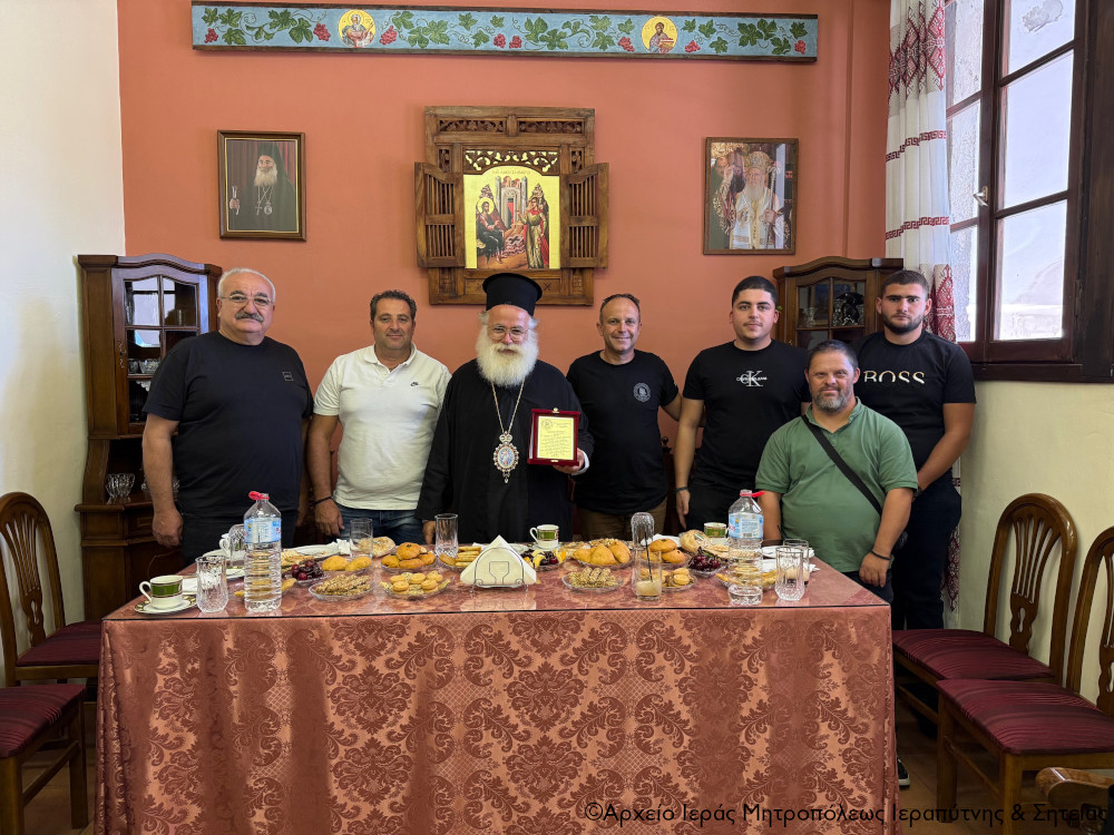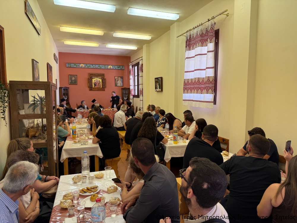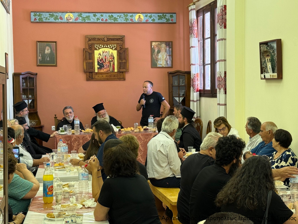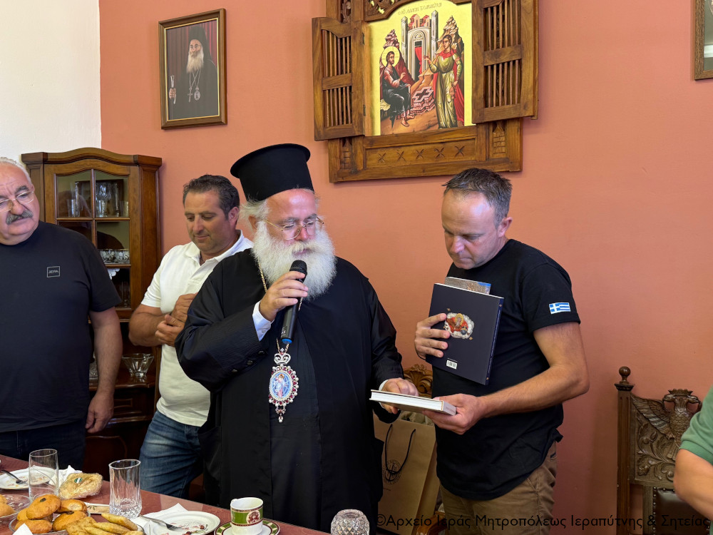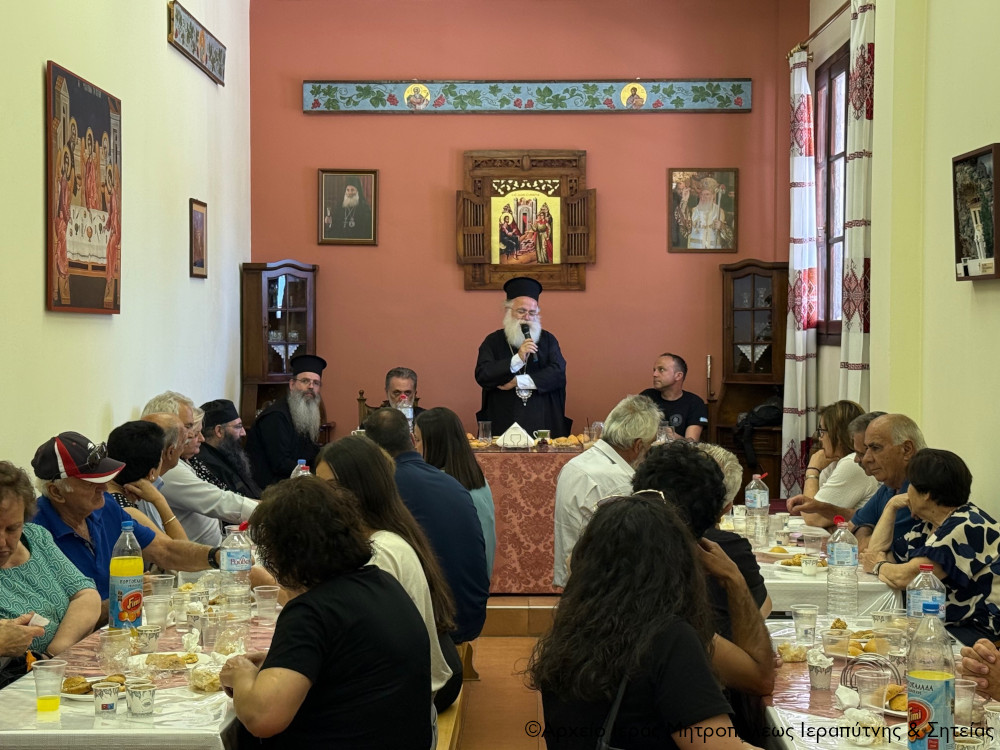 Ακολούθησε δεξίωση στην αίθουσα εκδηλώσεων του ναού, προσφωνήσεις και ανταλλαγή δώρων. Ο Σεβ. κ. Κύριλλος καλωσόρισε τους χωριανούς του με θερμούς λόγους και τους μίλησε για τις αξίες της παράδοσης και της ιστορίας στις μέρες μας. Προσέφερε δε βιβλία από τις πρόσφατες εκδόσεις της Μητροπόλεως για τη Βιβλιοθήκη του Συλλόγου. Ο Πρόεδρος του Πολιτιστικού Συλλόγου κ. Γιώργος Φραγκιαδάκης ευχαρίστησε τον Σεβ. κ. Κύριλλο και την αγάπη του και του πρόσφερε για τα ονομαστήριά του μία αναμνηστική πλακέτα εκ μέρους όλων χωριανών του, διερμηνεύοντας τα αισθήματα αγάπης και σεβασμού προς το πρόσωπό του.