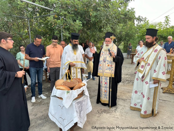 Μετά την ευλόγηση των προσφερόμενων άρτων ο Σεβασμιώτατος Μητροπολίτης κ. Κύριλλος κήρυξε τον θείο λόγο για το ιερό πρόσωπο της Παναγίας, η ταπεινή κόρη της Ναζαρέτ, που αποτέλεσε «σκεύος εκλογής» του Θεού και κατέστη η γέφυρα που συνέδεσε τη γη με τον ουρανό, όταν απλά και ταπεινά δέχθηκε το θέλημα του Θεού για να υπουργήσει το σχέδιο της θείας οικονομίας.