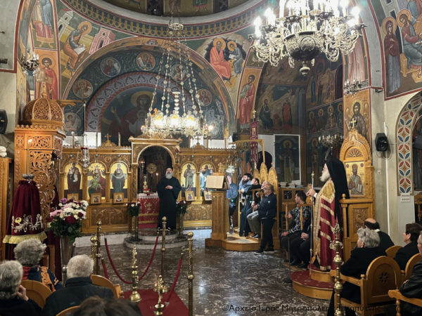 Μετά την Απόλυση Σεβασμιώτατος Μητροπολίτης κ. Κύριλλος ευχαρίστησε ιδιαιτέρως τον ομιλητή π. Δημήτριο Στρατή, Αναπλ. Καθηγητή Πατρολογίας στην Πατριαρχική Ανώτατη Εκκλησιαστική Ακαδημίας Κρήτης, που τόσο όμορφα και γλαφυρά μίλησε για το ιερό πρόσωπο της Παναγίας Μητέρα του Θεού και όλων των ανθρώπων, ευχήθηκε δε στο εκκλησίασμα καλή Μεγάλη Τεσσαρακοστή και ευλογημένη πορεία προς το Άγιο Πάσχα.