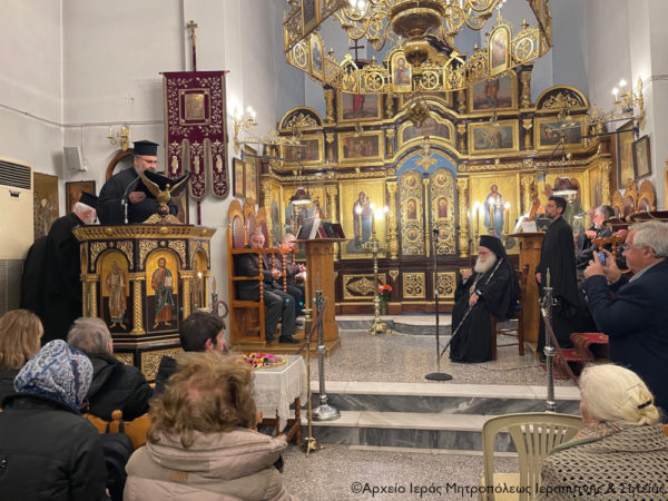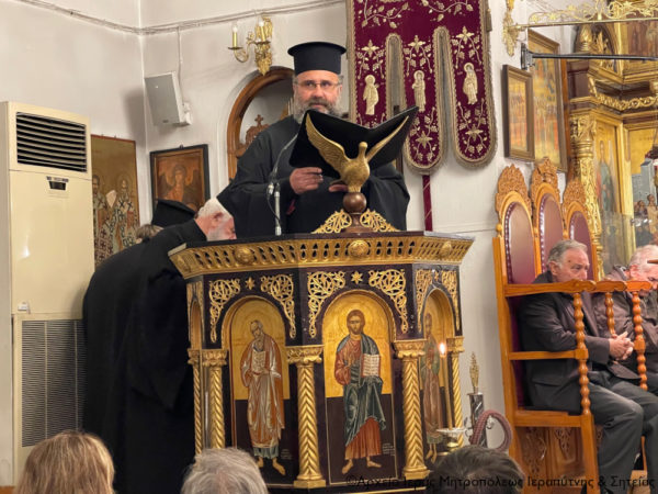 Μετά το πέρας της ακολουθίας του Αρχιερατικού Κατανυκτικού Εσπερινού, κατά τη διάρκεια του οποίου τέθηκε σε προσκύνηση Τίμιος Σταυρός με Τίμιο Ξύλο από την Ιερά Μονή Τοπλού, ακολούθησε επίκαιρη ομιλία με θέμα: «Ο Σταυρός του Χριστού συνοδοιπόρος του χριστιανού προς την Ανάσταση», από τον Αιδεσιμολ. πρωτ. Αθανάσιο Ταρλαντέζο, προϊστάμενο του Ιερού Μητροπολιτικού Ναού Αγίου Γεωργίου Ιεράπετρας.