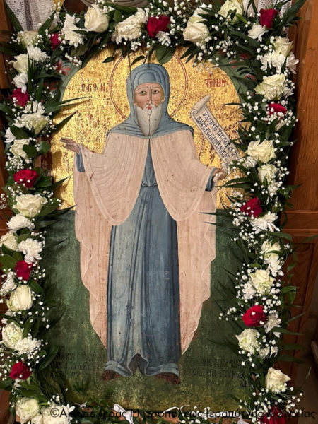 Στη μεστή και γλαφυρή ομιλία του ο Σεβασμιώτατος αναφέρθηκε στην προσωπικότητα και τον βίο του εορταζόμενου αγίου, όπως τον κατέγραψε ο Μέγας Αθανάσιος, Πατριάρχης Αλεξανδρείας, σημειώνοντας ότι ο άγιος Αντώνιος ήταν ο οργανωτής και θεμελιωτής του αναχωρητικού βίου, καθώς μέχρι τα μέσα του 3ου αι. μ.Χ. δεν υπήρξε οργανωμένος μοναχισμός, και ο δάσκαλος όλων των ασκητών, που βρήκαν κοντά του καταφύγιο. Ιδιαίτερη αναφορά έκανε στα ασκητικά παλαίσματα και τις μεθοδείες του διαβόλου που αντιμετώπισε ο Μέγας και Καθηγητής της Ερήμου με την καλλιέργεια των αρετών του και κυρίως την αρετή της ταπείνωσης.