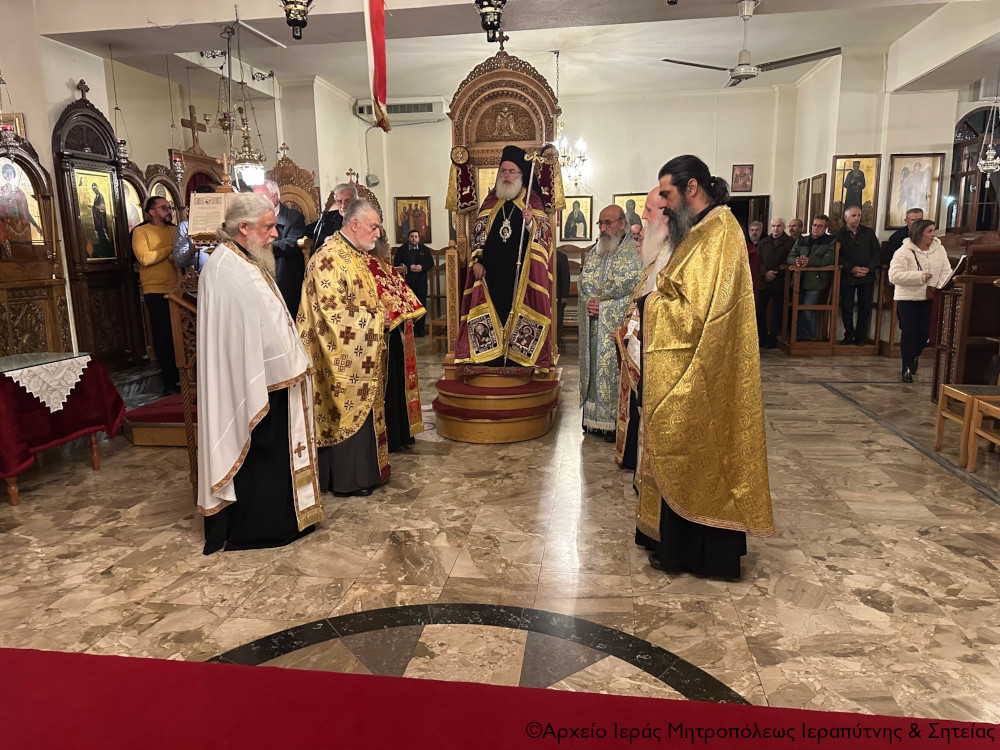 Στον Αρχιερατικό Εσπερινό της πανηγύρεως του Ιερού Ναού της Υπαπαντής του Κυρίου έλαβαν μέρος ο Ηγούμενος της Ι. Μονής Τοπλού και Πρωτοσύγκελλος της Ι. Μητροπόλεως Αρχιμ. Αμβρόσιος Σκαρβέλης, ο Προηγούμενος της Ι. Μονής Τοπλού Αρχιμ. Φιλόθεος Σπανουδάκης, οι συνταξ. Εφημέριοι πρωτ. Μιχαήλ Θαλασσινός και πρωτ. Εμμανουήλ Αυγουστινάκης, οι Εφημέριοι των Ενοριών Αγίου Γεωργίου πόλεως Σητείας πρωτ. Νικόλαος Αλεξάκης, Ευαγγελισμού Θεοτόκου Σητείας Πρωτ. Φιλοκτήμων Αυγουστινάκης, Πισκοκεφάλου Οικονόμος Αντώνιος Μεταξάκης, και ο Διάκονος Θεμιστοκλής Μπεϊνάς, ενώ από το Ιερό Βήμα παρέστη συμπροσευχόμενος ο πολιός πρωτ. Γεώργιος Γουλιέλμος.