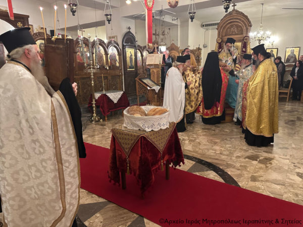 Στην ακολουθία χοροστάτησε κατά τάξη ο Σεβ. Μητροπολίτης Ιεραπύτνης και Σητείας κ. Κύριλλος, ο οποίος, συμπαραστατούμενος από τους Εφημερίους της πόλεως και άλλων Ενοριών της περιοχής, ευλόγησε τους προσφερόμενους άρτους και κήρυξε κατάλληλα τον θείο λόγο.