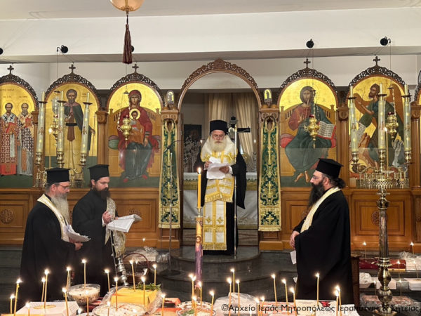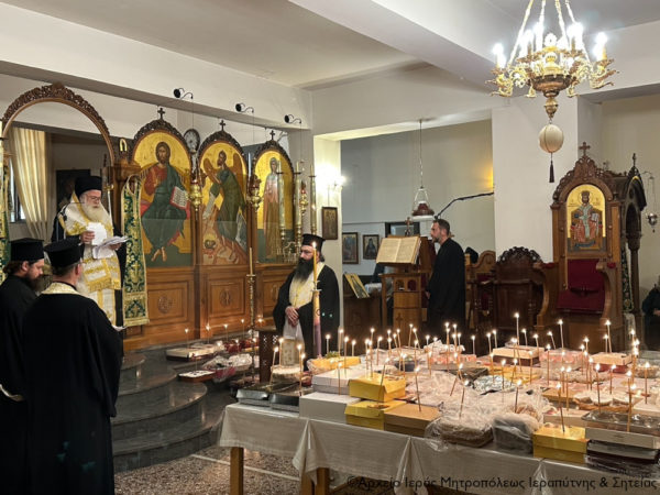 Αμέσως μετά τον Νεκρώσιμο Κανόνα που εψάλη στον Εσπερινό, προέστη στο διατεταγμένο ιερό Μνημόσυνο υπέρ αναπαύσεως των ψυχών «πάντων τῶν ἐπ᾽ ἐλπίδι ἀναστάσεως ζωῆς αἰωνίου κεκοιμημένων εὐσεβῶν καί ὀρθοδόξων χριστιανῶν, βασιλέων, πατριαρχῶν, ἀρχιερέων, ἱερέων, ἱερομονάχων, διακόνων, μοναχῶν, πατέρων, προπατόρων, πάππων, προπάππων, γονέων, συζύγων, τέκνων, ἀδελφῶν καί συγγενῶν ἡμῶν ἀπ᾽ ἀρχῆς μέχρι τῶν ἐσχάτων…» και μνημόνευσε τα ονόματα των κεκοιμένων μαζί με τους Εφημερίους του ναού Αρχιμ. Πορφύριο Αγγελάκη και Γεώργιο Λογκάκη ενώπιον των κολλύβων, ευχόμενος μετά την Απόλυση ο Κύριος της ζωής και του θανάτου να αναπαύει τις ψυχές των προσφιλών κεκοιμημένων αδελφών μετά των Αγίων και των Δικαίων και εν Χώρα Ζώντων.