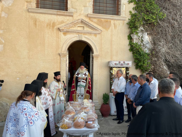 Πριν την Απόλυση ευλόγησε τους προσφερόμενους άρτους στον αύλειο χώρο του Καθολικού και μίλησε στους πολυπληθείς προσκυνητές για την μεγάλη εορτή της Κοιμήσεως της Παναγίας, για το ιερό της πρόσωπο αλλά και για την ιερή σχέση που έχουν οι Λασιθιώτες με την Παναγία την Φανερωμένη. Η μεγάλη Μάνα όλων μας, η Κυρία η Φανερωμένη, ανέφερε ο μεταξύ άλλων ο Σεβασμιώτατος, στέκεται στον ιερό βράχο της ακοίμητος φρουρός και συμπαραστάτης όλων μας καθόλη τη διάρκεια του χρόνου, ιδιαιτέρως όμως αυτές τις άγιες μέρες του Δεκαπενταυγούστου, του Πάσχα του καλοκαιριού, όπως το ονομάζει ο Θεοτοκόφιλος λαός μας. Εκείνη είναι ο αποδέκτης των αιτημάτων μας, ο φίλος μας, η παρηγοριά και η απαντοχή μας. Είναι η ακαταίσχυντη ελπίδα όλων μας, γιατί παρόλο που μετέστη στους ουρανούς, εντούτοις δεν εγκατέλειψε τη γη. Είναι δίπλα σε κάθε πόνο, σε κάθε δυσκολία, σε κάθε περίσταση και πρόβλημά μας. Είναι ο συγκυρηναίος μας για να σηκώσουμε αγόγγυστα τον σταυρό μας.
