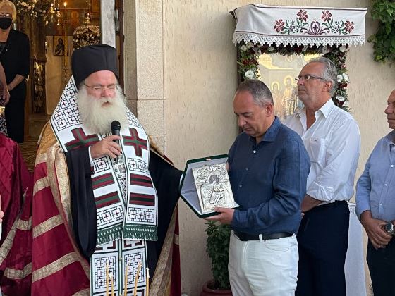 Τέλος, καλωσόρισε με εγκάρδιους λόγους τον εντιμότατο συντοπίτη Υπουργό Ναυτιλίας και Νησιωτικής Πολιτικής κ. Ιωάννη Πλακιωτάκη, στον οποίο επέδωσε ένα αντίγραφο της εικόνας της Παναγίας της Φανερωμένης και του ευχήθηκε η Παναγία να τον στηρίζει και να τον ενδυναμώνει στο σπουδαίο έργο που επιτελεί στο νευραλγικό Υπουργείο που υπηρετεί για το καλό της Πατρίδας μας. Επίσης, τον ευχαρίστησε για την ουσιαστική συμβολή του στις αρξάμενες μετά την πανήγυρη του Δεκαπενταυγούστου αναστηλωτικές εργασίες του κτηριακού συγκροτήματος της Μονής.