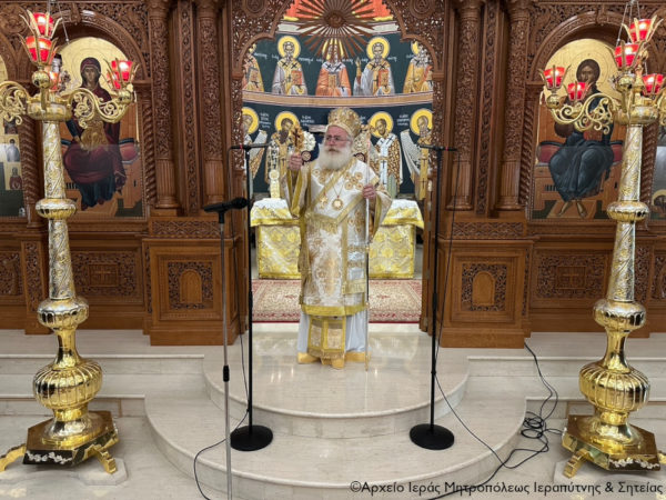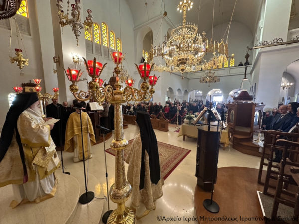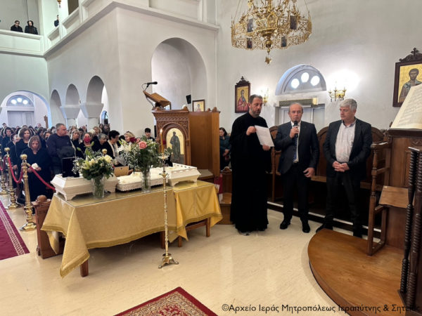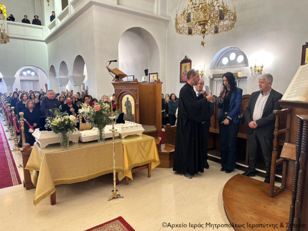 Πριν την Απόλυση της Αρχιερατικής Θείας Λειτουργίας κατ᾽ εντολή και Απόφαση της Ιεράς Επαρχιακής Συνόδου της Εκκλησίας Κρήτης τέλεσε το διετές μνημόσυνο για τα θύματα που τελειώθηκαν μαρτυρικά στο φρικτό δυστύχημα των Τεμπών και επίσης τα ιερά μνημόσυνα υπέρ αναπαύσεως των μακαριστών Νίκης Αγγελάκη (τεσσακονθήμερο) Δημητρίου Αρώνη (εννεάμηνο) και Σοφοκλή Καμίνη (εννεάμηνο).
