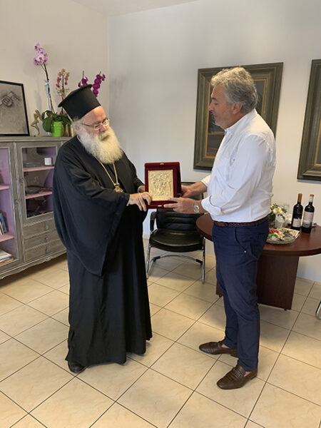 Τον Δήμο Σητείας επισκέφτηκε την Παρασκευή 20 Σεπτεμβρίου ο Σεβ. Μητροπολίτης Ιεραπύτνης και Σητείας κ. Κύριλλος. Τον Σεβ. κ. Κύριλλο υποδέχτηκε στην είσοδο του Δημαρχείου ο νέος Δήμαρχος κ. Γεώργιος Ζερβάκης με τους συνεργάτες του. Η εθιμοτυπική συνάντηση πραγματοποιήθηκε σε ιδιαίτερα θετικό και θερμό κλίμα, καθώς ο Σεβ. Μητροπολίτης κ. Κύριλλος και ο νεοεκλεγείς Δήμαρχος κ. Ζερβάκης είχαν την ευκαιρία να ανταλλάξουν απόψεις και να συζητήσουν από κοντά για διάφορα ζητήματα κοινού ενδιαφέροντος, όπως είναι η πορεία της σχεδιαζόμενης επένδυσης σε εκτάσεις του Κοινωφελούς Ιδρύματος «Παναγία η Ακρωτηριανή», η υλοποίηση του έργου δημιουργίας Λαογραφικού Μουσείου στην Ιερά Μονή Τοπλού, η ανέγερση του Γηροκομείου Σητείας, η διαμόρφωση του αύλειου χώρου του Ιερού Καθεδρικού Ναού της Αγίας Αικατερίνης κ.α.