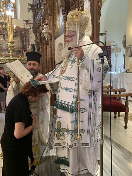 Πριν την Απόλυση ο Σεβ. κ. Κύριλλος χειροθέτησε σε Εκκλησιάρχισσα την κ. Ευαγγελία χα Γεωργίου Μυλωνάκη, αναγιγνώσκοντας την σχετική ευχή εις εκκλησιαστική διακονία, στην οποία ευχήθηκε να είναι άξια στην νέα της αποστολή στο σώμα της Εκκλησίας του Χριστού, με τις πρεσβείες του Αγίου Γεωργίου και να συνεχίζει για πολλά χρόνια να υπηρετεί με ζήλο και αυταπάρνηση στον Μητροπολιτικό Ναό.